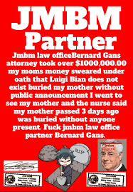 Suing JMBM partner $500,000,000,000.00 Busted criminal attorneys Jeffer Mangels Butler & Mitchell LLP lawyer Bernard Reginald Gans #57068 Bernard Gans Mina Sirkin law group JMBM killed my mom to get her fortune.Suing JMBM partner $500,000,000,000.00 Busted criminal attorneys Jeffer Mangels Butler & Mitchell LLP lawyer Bernard Reginald Gans #57068 Bernard Gans Mina Sirkin law group JMBM killed my mom to get her fortune..
